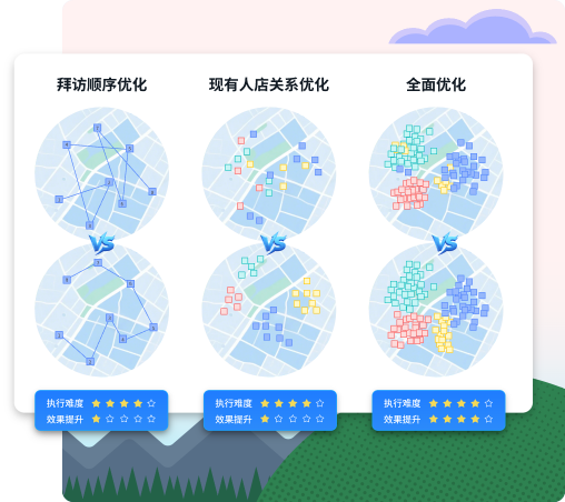 现有人店关系优化:保持现有人店关系,调整业代拜访日期并规划每日门店拜访顺序,显著提升拜访效果。