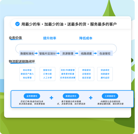 主路线规划 :综合考虑交通状况、路况限制等因素,规划出高效经济的主路线,让客户用最少的车,加最少的油,送最多的货,服务最多的客户 。